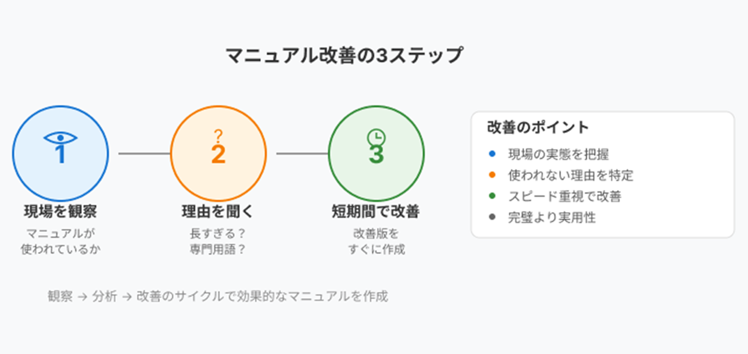 - ステップ1:現場でマニュアルが開かれているか観察する