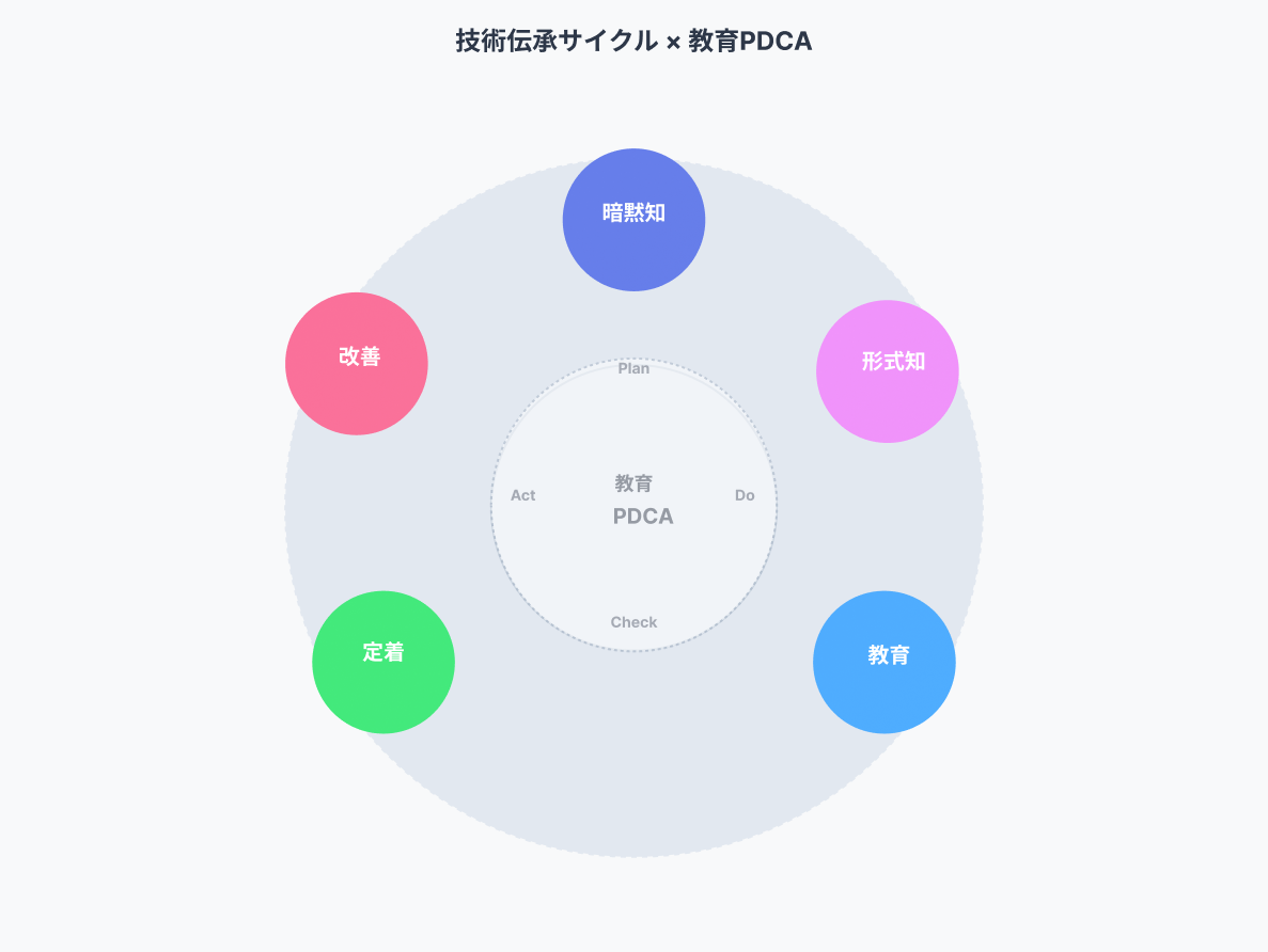 技術伝承は「暗黙知 → 形式知 → 教育 → 定着 → 改善」というサイクルで進める必要があります。ベテラン作業者の知識をマニュアル化(形式知化)し、それを新人教育・スキルマップ・eラーニングなどの教育ツールと連動させることで、継続的に改善・更新される仕組みを作ります。