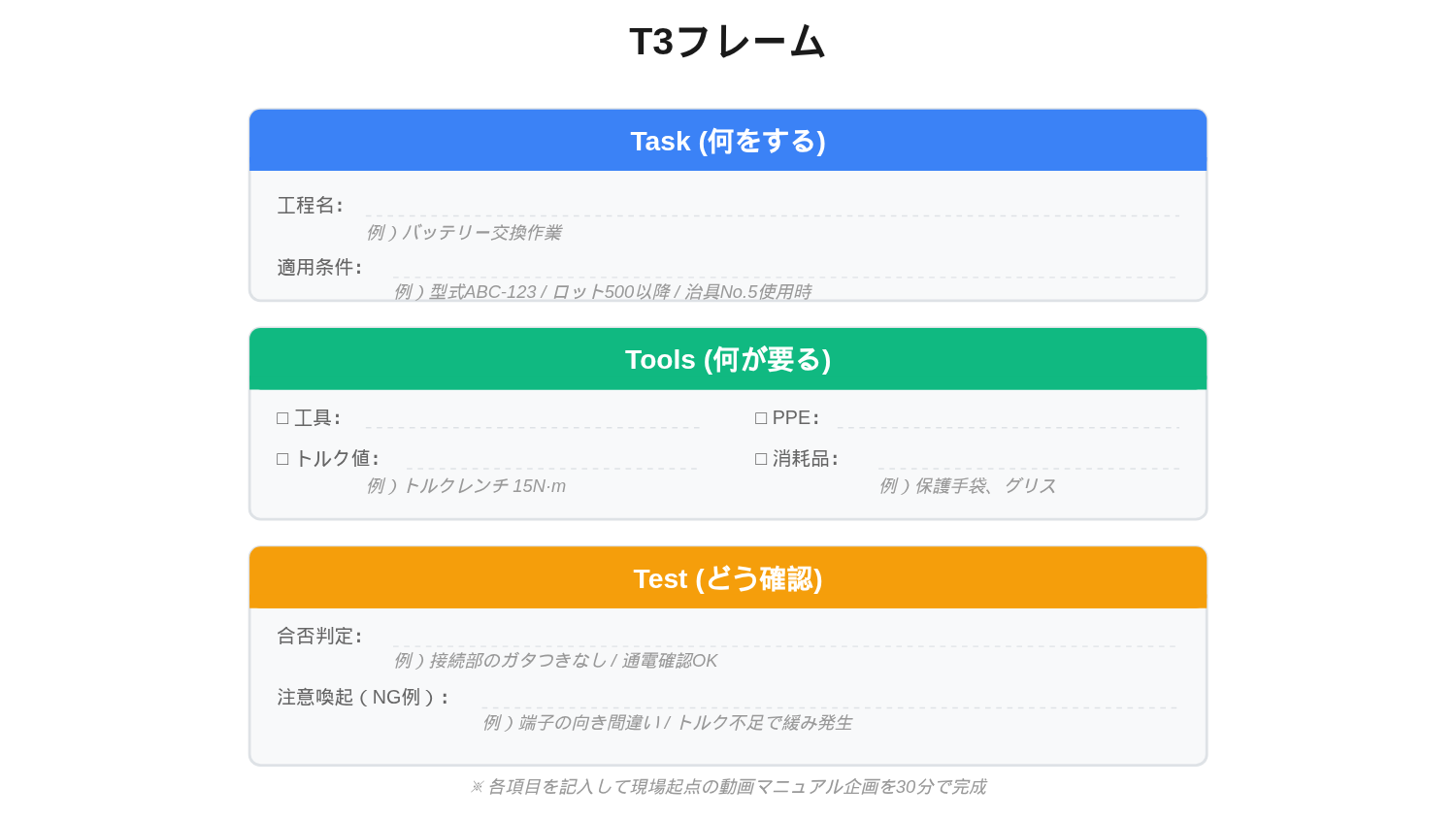 - Task(何をする):工程名と適用条件(型式/ロット/治具)を1文で定義
