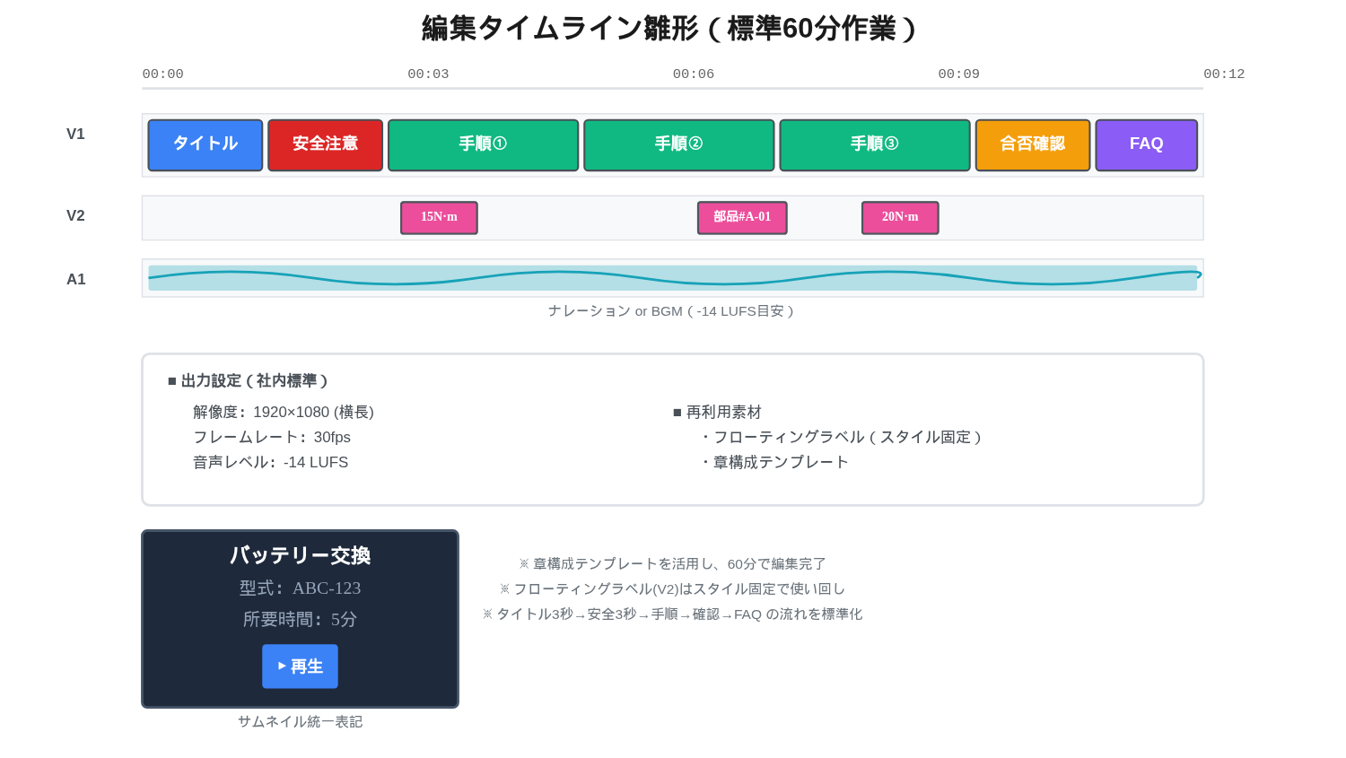 - 出力は横長1080p/30fps、音声レベル-14 LUFSを目安(社内標準に合わせる)