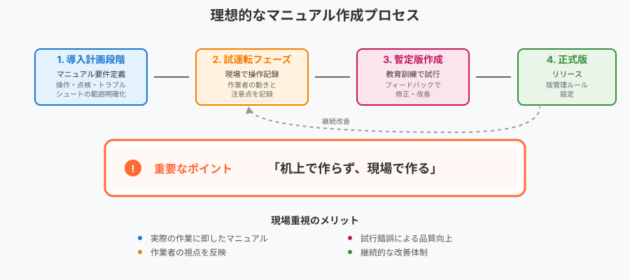 ある工場でロボット搬送設備を導入した際、試運転中に現場オペレーターが実際に操作しながら記録をとる方法を取りました。その結果、正式運用前に現場に即したマニュアルが完成し、教育時間が従来の半分以下に短縮されました。