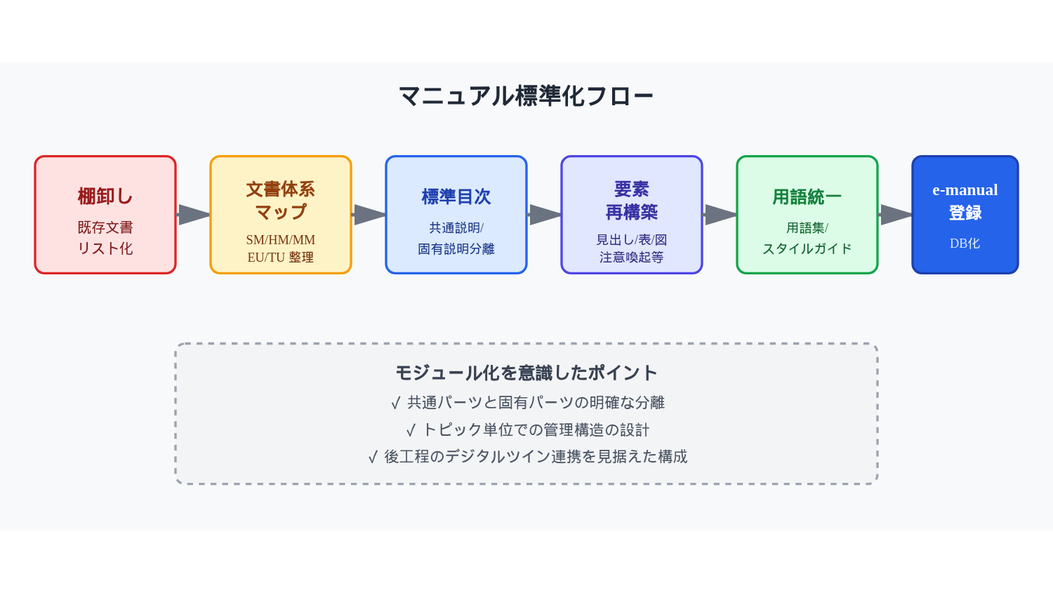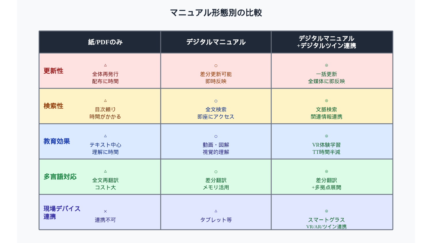 このように、デジタルマニュアル基盤を整備しておくことで、多言語・多拠点展開とデジタルツイン活用を同時に進めることができます。