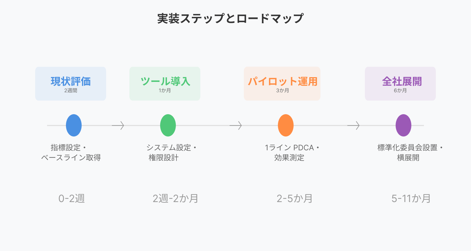 - 全社展開(6か月):標準化委員会を設置し横展開